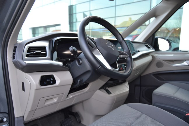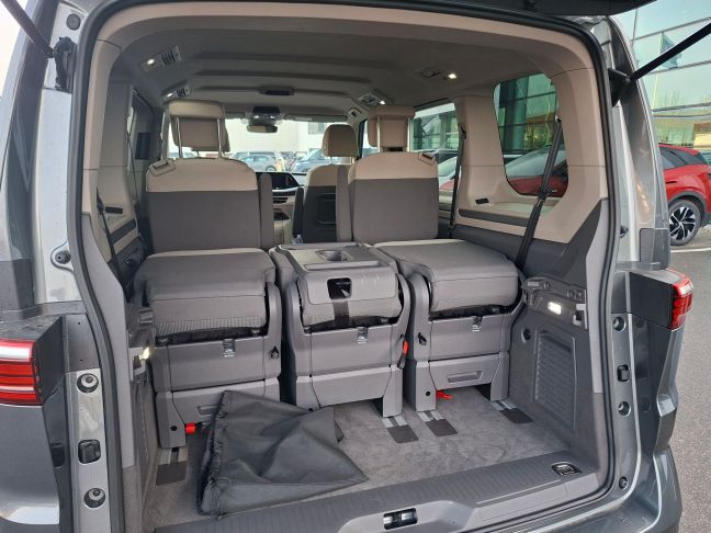 Jeg tror noget af det der gør at jeg altid har haft et godt øje til T5 multivan var blandt at jeg som stor knægt så et meget gennemført stylet eksemplar udstillet på Odense dyreskue af alle steder. Det var helt tilbage i 2005 eller 6 og min første reaktion var ligesom idag at det er altså en meget fed shuttlebus. Men jeg har altid også kunne lide måden at den var præsenteret på med hensyn til udstyr materialvælg og farvetemaer i interiøret. Især de højere udstyrsniveauer high line og buisness sælger virkelig præmissen om en VIP shuttlebus. Og selvom at T7eren ikke helt formår at levere samme følelse blandt andet på grund af den generelle kvalitetsfornemmelse i kabinen i forhold til tidligere VW produkter og at man bare ikke har den samme interne volumen fordi at man har valgt at gå mere hen af MPV vejen rent designmæssigt. Så er det stadigvæk en rigtig fin bus. Selvom at det er den korte model har man stadigvæk 3 brugbare sæderækker og så er der skinner bygget ind i gulvet så man i typisk Multivan facon kan konfigurere kupéen efter egne ønsker. Med tredje række sat til maksimal benplads har man selvfølgelig ikke så meget bagageplads. Men det er en karakteristika for de fleste 3 rækkers biler uforagtet hvilken biltype at det er. Jeg kan også godt lide førerpladsen. Selvom at kvalitetsfølelsen ikke helt er der som tidligere. Så er den yderst funktionel med massere af aflægningsrum. Og så er ergonomien helt fint ligesom at man har en god kørestilling og et godt udsyn takket værre vinduesarealet fortil. Og så sidder man ganske komfortabelt både for og bag. Men jeg kan også virkelig godt lide letkørtheden og bussens generelle fremfærd. Styretøjet styrer let og smidigt med en fin udveksling uden stadigvæk at føles nervøs ved motorvejskørsel. Undervognen balancere fint imellem komfort og dynamik hvor at den stadigvæk føles retningsstabil ved motorvejsfart. Og så er rulle og vindstøj også holdt respektable niveauer alle kørescenarier igennem. Jeg kunne uden problemer føre en samtale med min makkker uden at skulle hæve stemmen selvom at vi sad i hver vores ende af bilen. Angående motor og gear gør den det faktisk også godt. Testbilen er en 1.4 E hybrid uden 4 motion altså bare med forhjulstræk og systemydelse på kun 218 heste i modsætning til 245 i denne senere 1.5 liters. Og man kan da også mærke fraværet af firhjulstræk under visse omstændigheder. Ved at man kan komme til spinde med forhjulene under igangsætning og at man generelt ikke har den resolutte acceleration fra 0 til 50 i timen som hvis den trak på alle fire poter. Men den har til trods for det stadigvæk et fint kraftoverskud. Hvor at veksling imellem benzin og eldrift sker gnidningsfrit. Og så skifter gearkassen smidigt ved stille kørsel og præcist ved en hurtig hastighedsændring. Imens at kickdown også virker som det skal. Men den respondere også ok når man kører i manuelt program med skiftepadlerne selvom at det passer bedst til dens natur at man kører hel automatisk. Jeg glemte næsten at sige at motorens gangkultur er ganske smidig eller så smidige at man nu kan lave en 1.4 liters række 4 med turbo og direkte indsprøjtning.