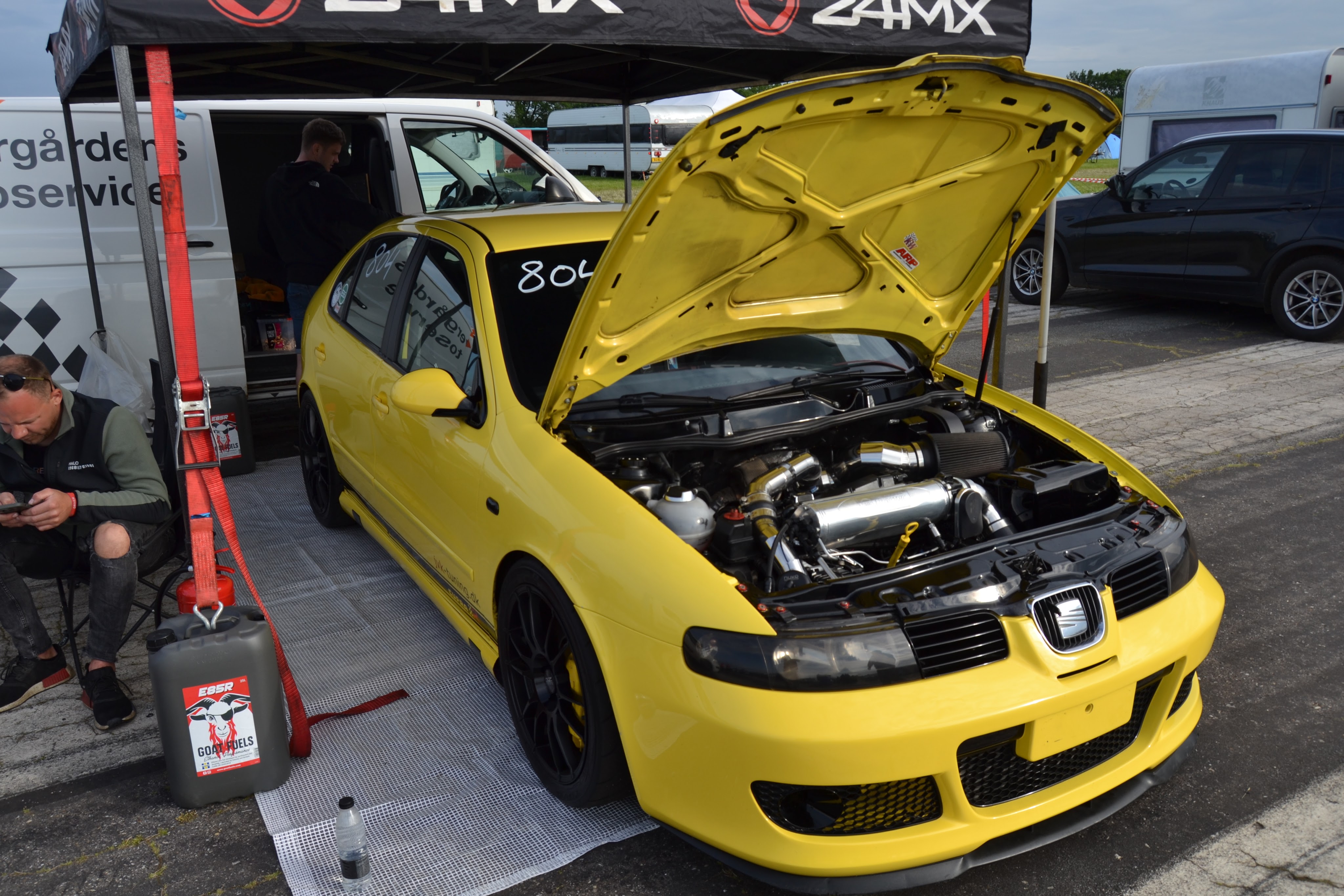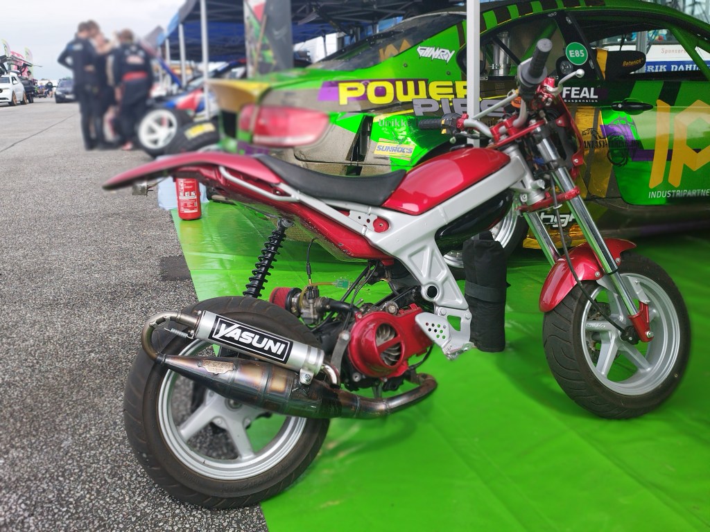 Selvom at det kun var GTTer med automatgear. Så ville jeg gerne havde set at denne meget flotte R34er havde stået min indkørsel.Der var overraskende mange tohjulere tilstede af forskellige slags. Her er det en veldrejet Street magic.Har aldrig troet at det eksisterede før nu. Men der findes mindst én Starlet dragbil med en tværliggende 2jz-gte hvor at der er koblet transakslen fra en MR2er bagpå.Men har så heller aldrig set en slangebøsse før med egne øjne og til det hentyder jeg selvfølgelig til dragsteren. Og ja de ældrere type dragstere med motoren foran blev faktisk kaldt en rail eller en slingshot (slangebøsse).Hvis jeg skulle kåre træffets mest imponerende driftbil udfra udseende og setup. Så må det nok værre denne FD RX-7 med singleturbo 2jz widebodykit og rørramme-snude.Men en lille Leon Cupra med stort turbo setup og Porsche bremser er absolut heller ikke så værst.selv på brænderpladsen gav drifterne et godt nummer.