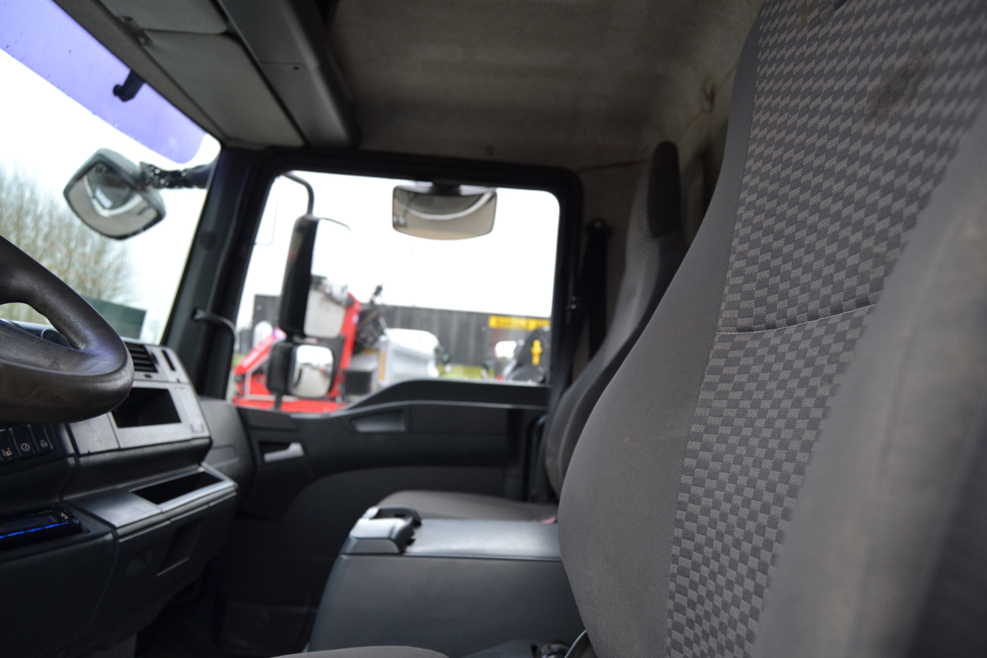 Det første bekendtskab at jeg havde med 12.180eren var da jeg kørte den faceliftede udgave til glatbanekursus under chauffør-uddanelsen. Jeg endte faktisk med at synes at den kørte ganske fin i sådan en grad at jeg godt ville teste et eksempel til bloggen så snart kørekortet var i hus og så snart at jeg kunne finde én. Og idag var det atter stævnemøde. Efter at have foretaget start eftersyn hopper jeg op i hytten igen spænder selen og sætter vognen i drive. Under de første par minutters kørsel kludrer den lidt i gearene med at hænge lidt for meget i hvert gear ligesom at gearskiftene er nogenlunde ligeså smidige som når man kører med en nyudklækket bilist som stadigvæk skal lære koblingspunktet. Alt dette er selvfølgelig normalt nu hvor at TGLeren ligesom de fleste andre lastvogne er udstyret med en automatiseret manuel gearkasse. For når man får noget varme i det hele skifter den faktisk sådan nogenlunde. Noget der faktisk også kører ganske fint er motoren. Denne bil er udstyret med en 4 cylindres maskine på 4.6 liter der yder 180 heste samt 700 i omdrejningsmoment. Motoren er kendt under motorkoden D0834 og når man også har kørt Scania V8 føles og lyder det mest af alt som at køre en forvokset varevogn. Man har den typiske pludren at en 4 cylindres dieselhakker udsteder. Men det føles ganske hyggeligt at køre med og fra førerpladsen føles TGLeren også en smule varebilsagtig. Selvfølgelig kan man sagtens mærke at man kører lastbil med hvordan betjeningen af især bremsepedalen med at den føles en smule ulden som den jo plejer at gøre når man kører med trykluft-mekaniske bremser. Men man sidder tætter til jorden og så er køretøjets udvendige dimensioner med til at gøre at det ikke føles som en stor og intimiderende maskine i samme grad som for eksempel en Scania Torpedo eller R500. Noget andet jeg kan sige er at styretøjet er let og smidigt så den er nem at manøvrere med på træng plads. Og så er udsynet rigtig fint på grund af de tynde A stolper og store vindues arealer. Angående udstyr og indretning er det her også en ganske ok vogn. Den er blandt andet udstyret med luftaffjedring på bagakslen oliefyr og en værktøjskasse monteret på chassisrammen under ladet.